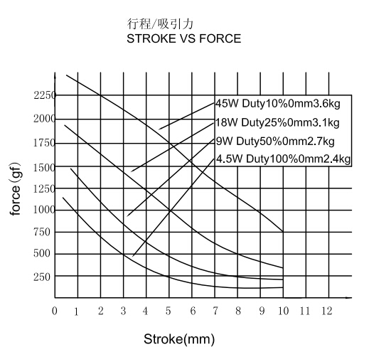 縱向:代表電磁鐵在對應(yīng)行程時的力量 單位為克(g)