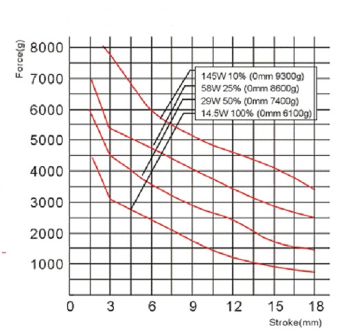 縱向:代表電磁鐵在對應行程時的力量 單位為克(g)